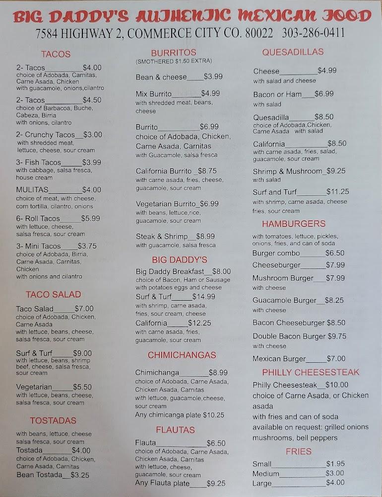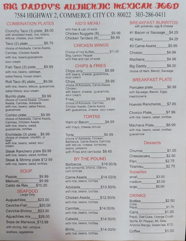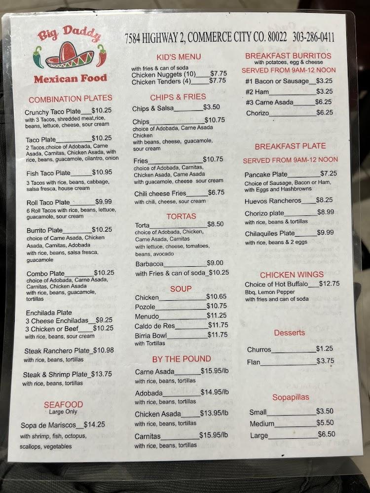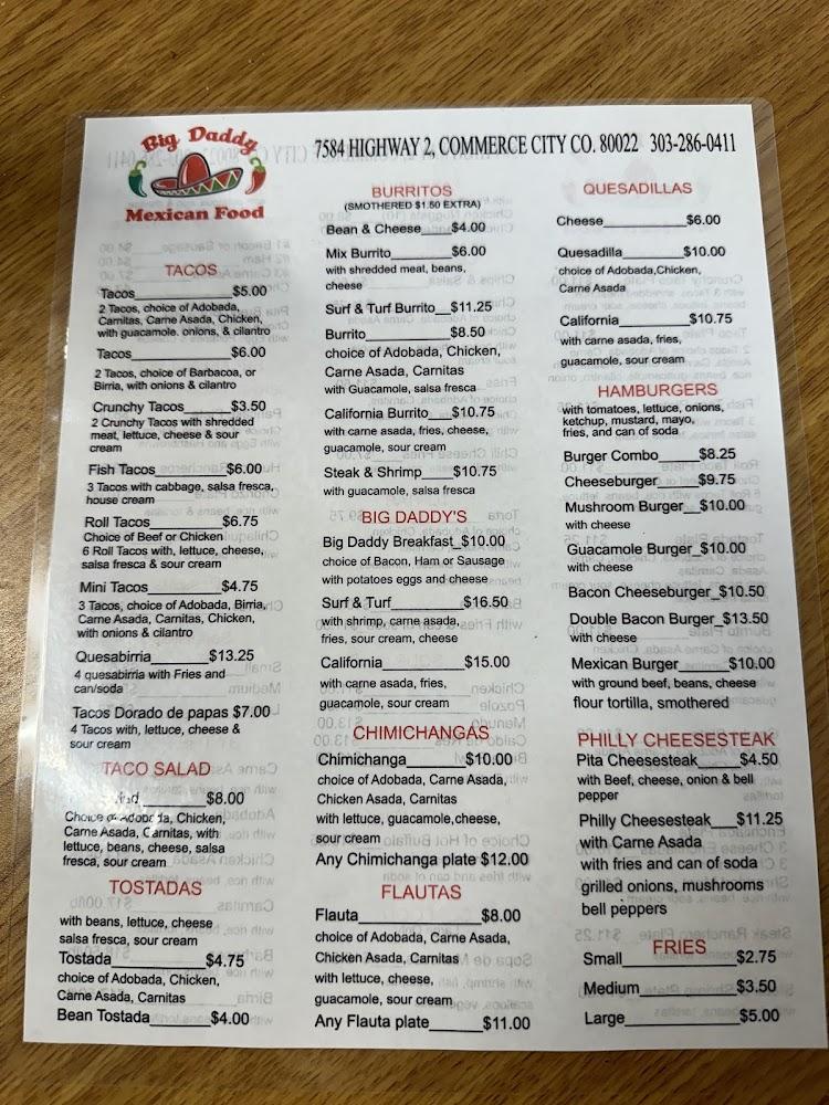 Welcome to Big Daddy Mexican Food, your go-to destination for vibrant and authentic Mexican flavors in Commerce City, CO. Conveniently located at 7584 CO-2, we offer a delightful array of traditional dishes perfect for breakfast, lunch, or dinner. Enjoy our quick service in a relaxed atmosphere, whether dining in or opting for takeout and delivery. Our menu features shareable small plates, delicious breakfasts, and kid-friendly options. With accessible seating, free Wi-Fi, and ample parking, Big Daddy is ideal for family gatherings or a casual solo meal. Join us for a taste of Mexico today!